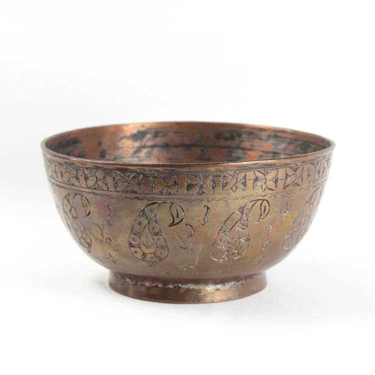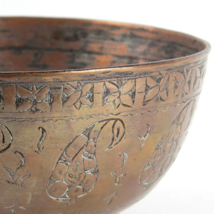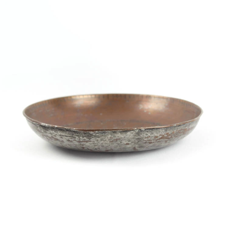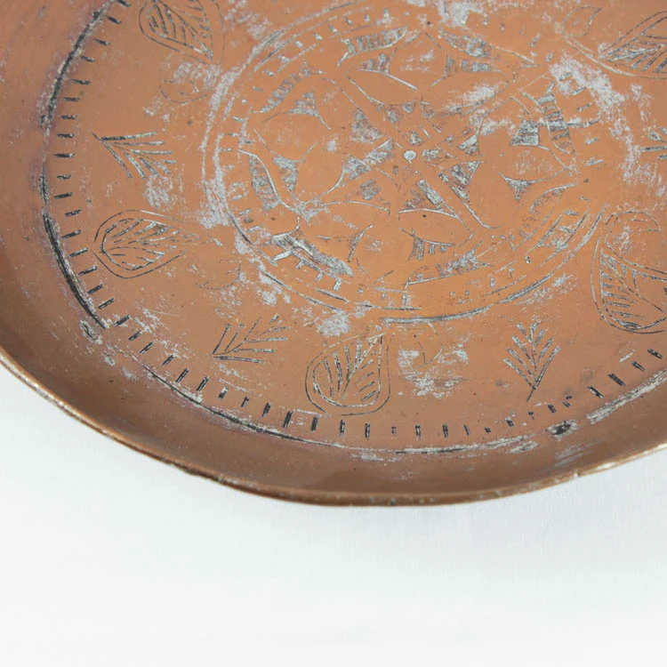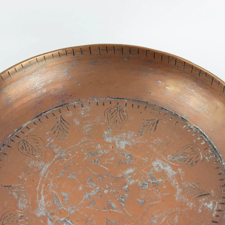 Piatto e Coppa in rame incisi e decorati con foglie ed elementi vegetali.