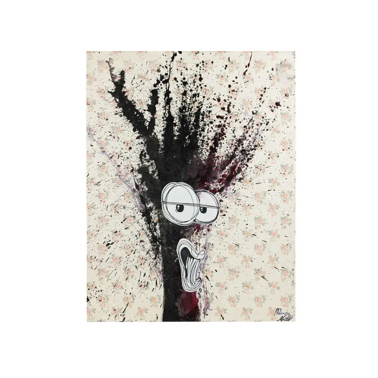 Lo schizzo di vernice vuole rappresentare l’interno dell’anima e l’espressione fumettistica è la maschera esterna dell’essere umano, con la sua reazione all’ambiente.