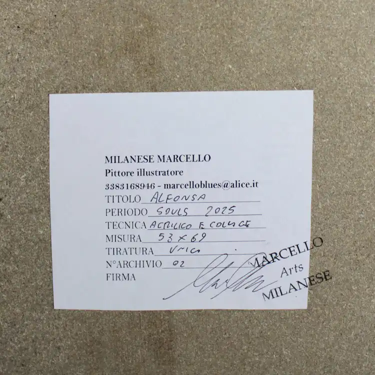 OPERA IN ACRILICO E COLLAGE – dalla collana SOUL 2025 di Marcello Milanese – Archivio 02 – opera unica – Titolo-ALFONSA.