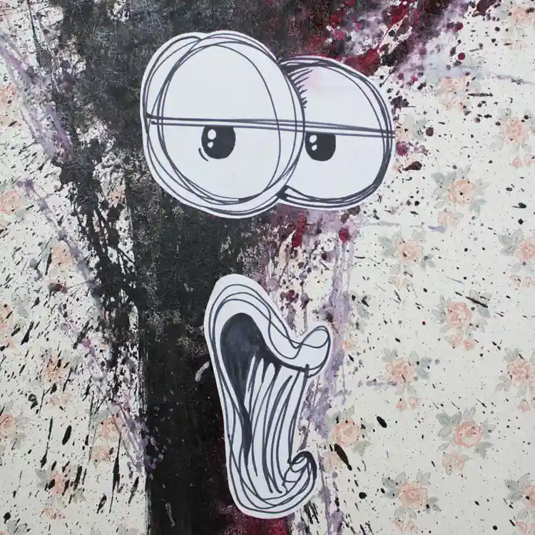 OPERA IN ACRILICO E COLLAGE – dalla collana SOUL 2025 di Marcello Milanese – Archivio 02 – opera unica – Titolo-ALFONSA Lo schizzo di vernice vuole rappresentare l’interno dell’anima e l’espressione fumettistica è la maschera esterna dell’essere umano, con la sua reazione all’ambiente. Le carte da gioco, o i quadri sullo sfondo di alcune opere, ne simboleggiano l’interpretazione del mondo esterno: in particolare tutti gli elementi sono stati, prima dell’applicazione sulla tela, colpiti da proiettili, simbologia della vita reale. L’uso di carta da parati vintage crea uno spazio falsamente confortevole alla rappresentazione artistica. I dipinti di Milanese sono specchi interiori oppure esorcizzazioni delle paure, e lasciano l’interpretazione al fruitore.