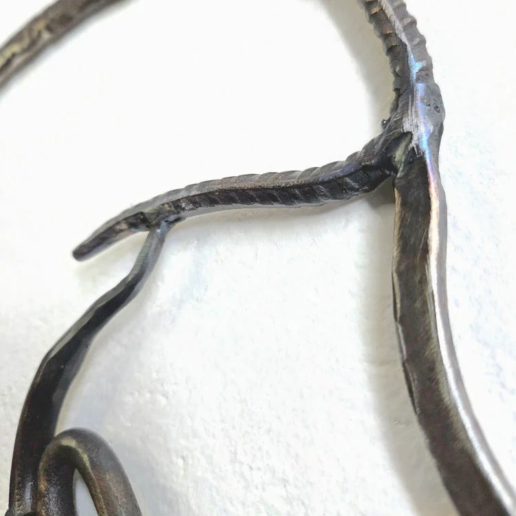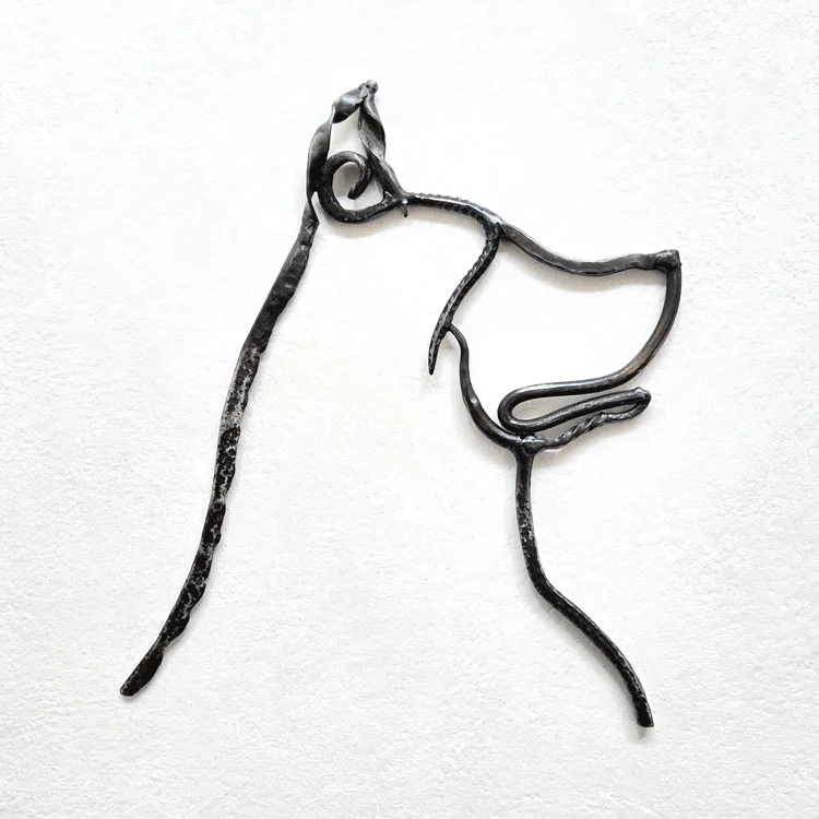 Scultura da parete che ritrae la testa di un Cane pastore. In un disegno di ferro ogni singolo elemento conserva la memoria della sua vita passata: tubi idraulici, barre per cemento armato, vecchi profili arrugginiti… L’unione dei vari pezzi forma la sagoma di un cane ritratto in un momento di attenzione. C’è qualcosa di profondo ed antico che ci lega ai cani: fiducia, affetto, senso di protezione, l’emozione di capire e sentirsi capiti da un esponente del regno animale.